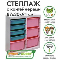 Купить Белый стеллаж труфаст 87х30х91 вертикальный двойной с бирюзовыми (4 шт) и розовыми (4 шт) контейнерами с доставкой по всей России.