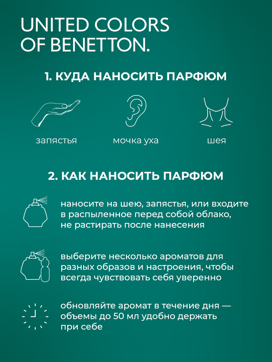 | Дополнительная информация | Распылите аромат непосредственно на кожу в точках пульса (шея, внутренняя сторона запястий и локтей,...), дайте ему высохнуть на воздухе, не растирая его. Для еще большей стойкости распылите его поверх лосьона для тела без запаха. Не использовать в пищевых целях. Избегать попадания в глаза Поскольку инновации и превосходство лежат в основе нашего бренда, список ингредиентов может измениться. Мы просим вас ознакомиться с информацией на упаковке продукта, особенно если вы подвержены риску аллергии. |