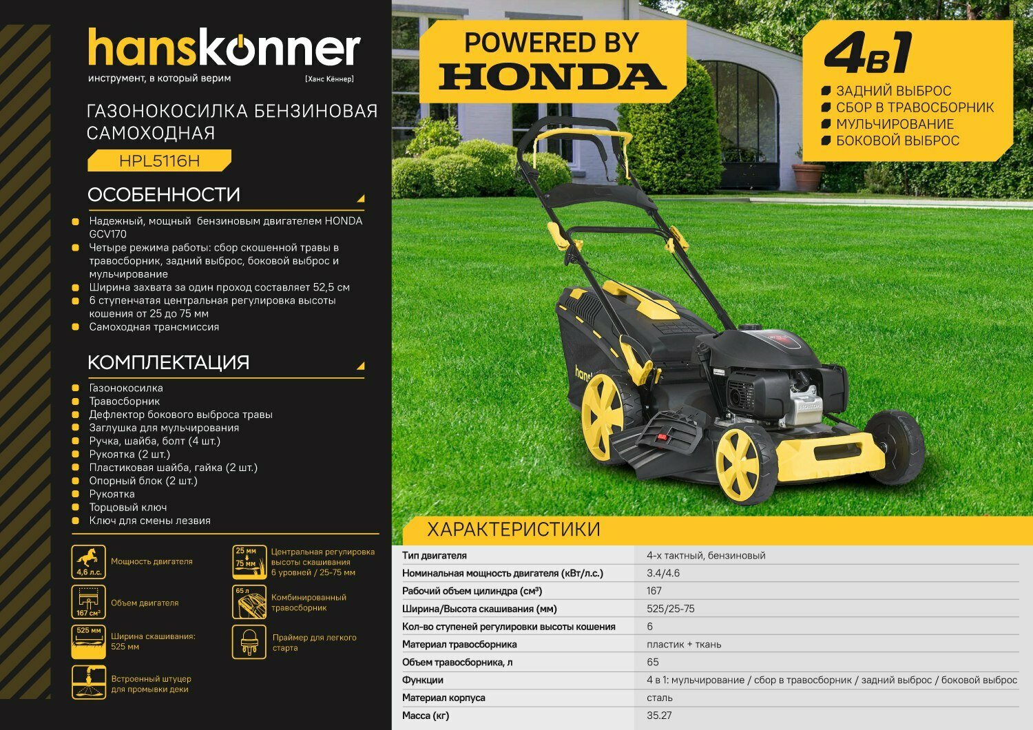 | Дополнительные функции | регулировка высоты скашивания, функция мульчирования |