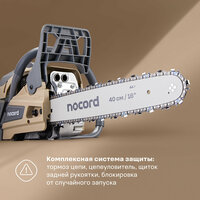 Бензиновая цепная пила NOCORD NS-4516 подходит для распиловки деревьев и подрезания веток. У инструмента продуманная система защиты. Тормоз цепи мгновенно останавливает её в случае обратного удара. Цепеуловитель и щиток задней рукоятки защитят от травмы, если цепь разорвется. Блокировка от случайного пуска — чтобы пила не включилась по ошибке.