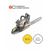 Пила оснащена надёжной свечой зажигания BOSCH. В комплекте оригинальный напильник OREGON, с которым удобно поддерживать цепь в рабочем состоянии. Пильная гарнитура сделана из износостойкой легированной стали 65Mn (шина) и 68CrNiMo (пильная цепь). В нижней части корпуса расположен отсек для хранения свечного ключа, чтобы инструмент всегда находился под рукой.