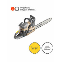 Пила оснащена надёжной свечой зажигания BOSCH. В комплекте оригинальный напильник OREGON, с которым удобно поддерживать цепь в рабочем состоянии. Пильная гарнитура сделана из износостойкой легированной стали 65Mn (шина) и 68CrNiMo (пильная цепь). В нижней части корпуса расположен отсек для хранения свечного ключа, чтобы инструмент всегда находился под рукой.