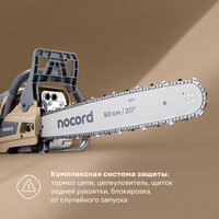 Бензиновая цепная пила NOCORD NS-5820 подходит для распиловки деревьев и подрезания веток. У инструмента продуманная система защиты. Тормоз цепи мгновенно останавливает её в случае обратного удара. Цепеуловитель и щиток задней рукоятки защитят от травмы, если цепь разорвется. Блокировка от случайного пуска — чтобы пила не включилась по ошибке.