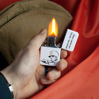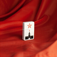 Классическая бензиновая зажигалка, выполнена из стали. Основной механизм плотно сидит внутри корпуса и вытаскивается для дозаправки (подходит Бензин высокой очистки Zippo, Бензин "Галоша", Нефрас С2-80). На лицевой стороне зажигалки нанесен рисунок с Московским Кремлём и красной звездой. На оборотной стороне зажигалки изображен красноармеец с винтовкой и Девиз "Никто, Кроме нас! Где мы - там победа!".