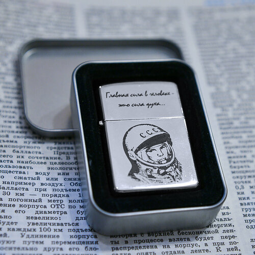 Классическая бензиновая зажигалка, выполнена из стали. Основной механизм плотно сидит внутри корпуса и вытаскивается для дозаправки (подходит Бензин высокой очистки Zippo, Бензин "Галоша", Нефрас С2-80). На лицевой стороне зажигалки нанесена гравировка с Юрием Гагариным и его цитатой "Главная сила в человеке - это сила духа."