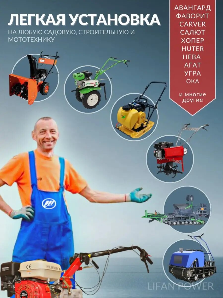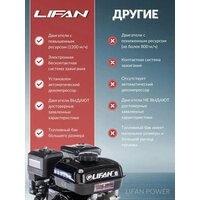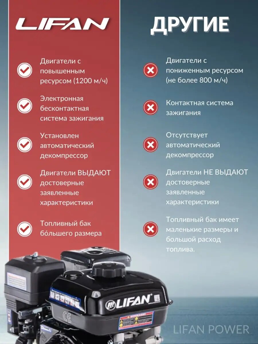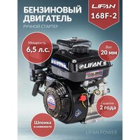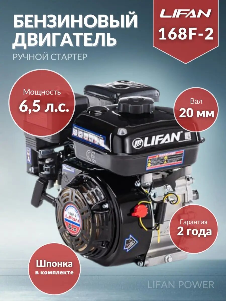 Лидер среди двигателей на отечественную и китайскую садовую, строительную и мототехнику. Lifan 168F-2 — это трудолюбивый «китаец», который с легкостью можно установить на любое садовое оборудование - мотоблоки, культиваторы, мотобуксировщики, снегоуборщики производителей Нева, Ока, Агат, Салют, Авангард, угра, PARTNER FOR Крот, GARDEN Фаворит, Carver, Хопер, Huter , Хутер, Калуга М. Старый мотоблок снова в строю, продолжает ударно вспахивать сотки родной земли. Ведь не зря в переводе с китайского Lifan означает «мчаться на всех парах»! Двигатель 6.5 л. с. Lifan 168F- идеальный бензиновый китайский двигатель для самоделки, для детской бензиновой машинки. Запчасть с универсальной площадкой для установки совместима с виброплитами, вибротрамбовками, подходит для картинга. Данная деталь в последние годы получил широкое распространение на различной технике, начиная от бензогенераторов, мотоблок бензиновый, садового культиватора, и заканчивая мотоциклами для бездорожья! Одноцилиндровый четырехтактный бензодвигатель не требует смешивания бензина и масла. Воздушное охлаждение исключает перегрев. Диаметр вала шкива, который вращается против часовой стрелки - 20 мм, длина - 50 мм. Скорость вращения регулируется автоматически. Рабочий объем двигателя для мототехники - 210 см3. За счет транзисторно-магнитного зажигания в виде датчика (TCI) усиливается искрообразование, поэтому даже непрогретый мотор запускается быстро. Декомпрессионный механизм и ручной стартер облегчают запуск двигателя для мотокультиватора. Максимальный крутящий момент достигает 10 Нм/2500 об/мин. Объем топливного бака - 3,6 л, масляного картера - 0,6 л. Топливный бак имеет резьбовое закручивание, что исключает вытекание бензина при работе. С помощью специального контроллера можно отслеживать уровень моторного масла. В случае его недостатка аварийная система автоматически отключит технику. Рекомендуется заливать моторное масло SAE 10W 30. Двигатель бензиновый 4-х такный Лифан 168F-2 относится к одноцилиндровым моделям двигателям. В качестве материала гильзы цилиндра используется чугун, что увеличивает моторесурс работы «движка».