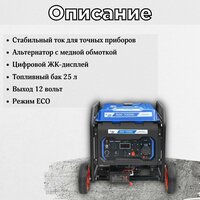 | Особенности | бесщёточный генератор, глушитель, звукоизоляционный кожух, инверторный генератор, колёса |
