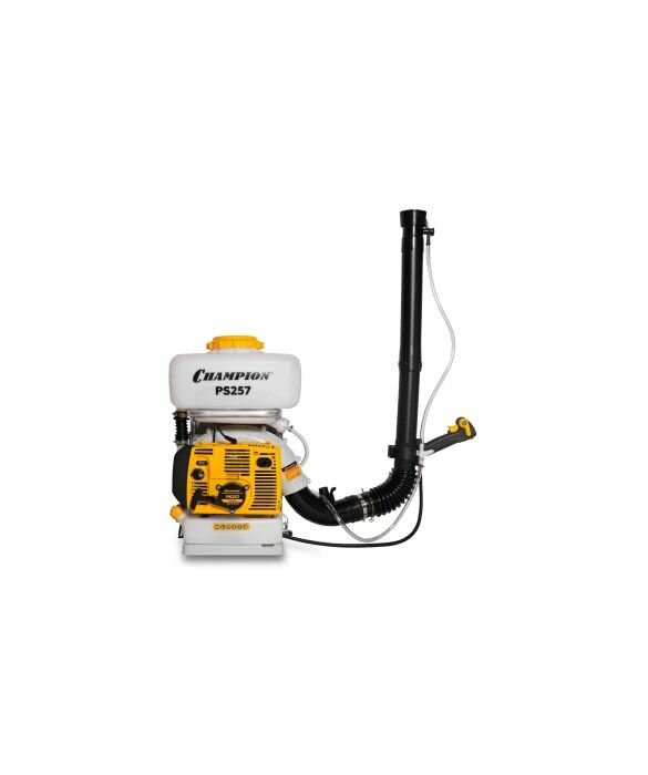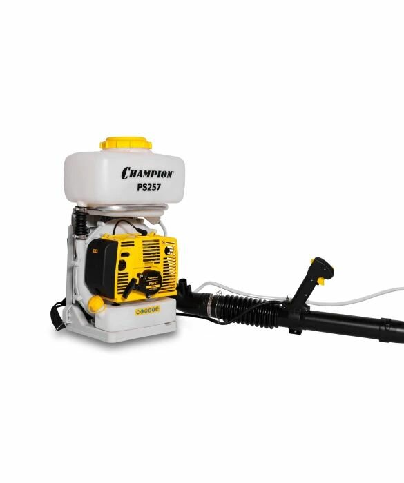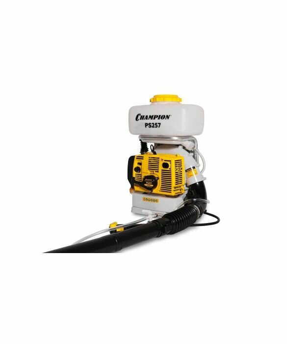 Разбрызгивающее устройство Чемпион PS257 имеет высокую производительность, которая достигается благодаря двухтактному двигателю, мощность которого составляет 3,4 лошадиных сил или 2,5 киловатта, а рабочий объём – 56,5 кубических сантиметров. Объем бака агрегата – 14 литров. Весит такое устройство 10,5 килограмм. Производителями являются Соединенные Штаты Америки и Китай.