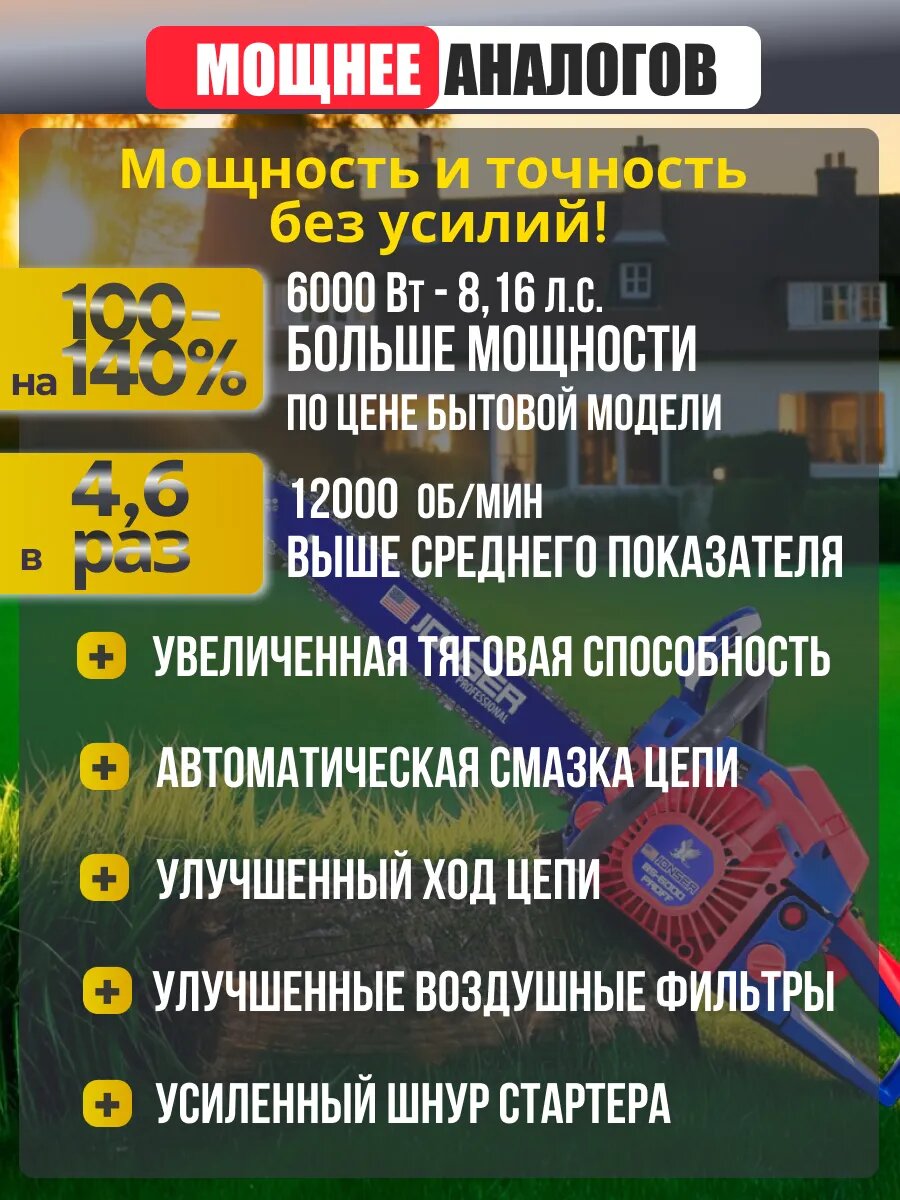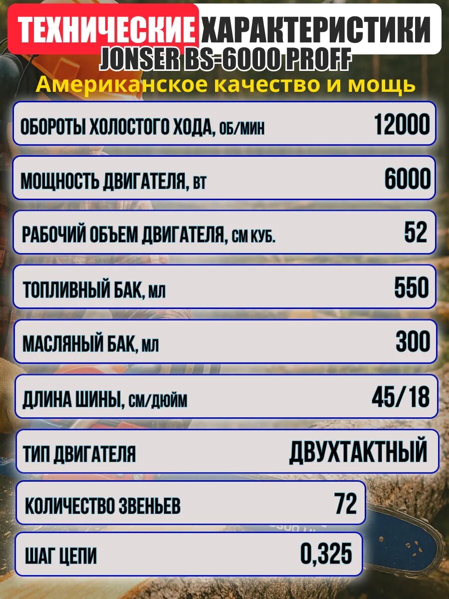 Купить Бензопила Jonser N_BS-6000 PROFF, 6000 Вт, 12000 об/мин, шина 45 см с доставкой по всей России. Бензопила Jonser N_BS-6000 PROFF, 6000 Вт, 12000 об/мин, шина 45 см: сравнение цен, характеристики, фото, актуальное наличие и цены.