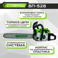 Бензопила Ставмаш БП528 – сравнительно лёгкий, компактный инструмент, позволяющий справляться со сложными задачами, где важна точность реза. БП528 - модель со средней мощностью двигателя, легко режет дрова, справляется с валкой небольших и средних деревьев. Цепь модели БП528 имеет 72 звена(45см), чего достаточно для глубокого реза. Чтобы предотвратить риск травмирования цепью, в компоновке данного инструмента использована защита – система инерционного торможения. Бензопила оборудована автоматической системой смазывания цепи, что полностью исключает её растяжение, а также перегрев и деформацию шины. Тип стартера - ручной с системой облегченного запуска(легкий старт).