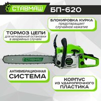Бензопила Ставмаш БП620 – сравнительно лёгкий, компактный инструмент , позволяющий справляться со сложными задачами, где важна точность реза. БП620 - модель с повышенной мощностью двигателя, легко режет дрова, справляется с валкой средних и крупных деревьев. Цепь модели БП620 имеет 76 звеньев(50см), чего достаточно для глубокого реза. Чтобы предотвратить риск травмирования цепью, в компоновке данного инструмента использована защита – система инерционного торможения. Бензопила оборудована автоматической системой смазывания цепи, что полностью исключает её растяжение, а также перегрев и деформацию шины. Тип стартера - ручной с системой облегченного запуска(легкий старт).