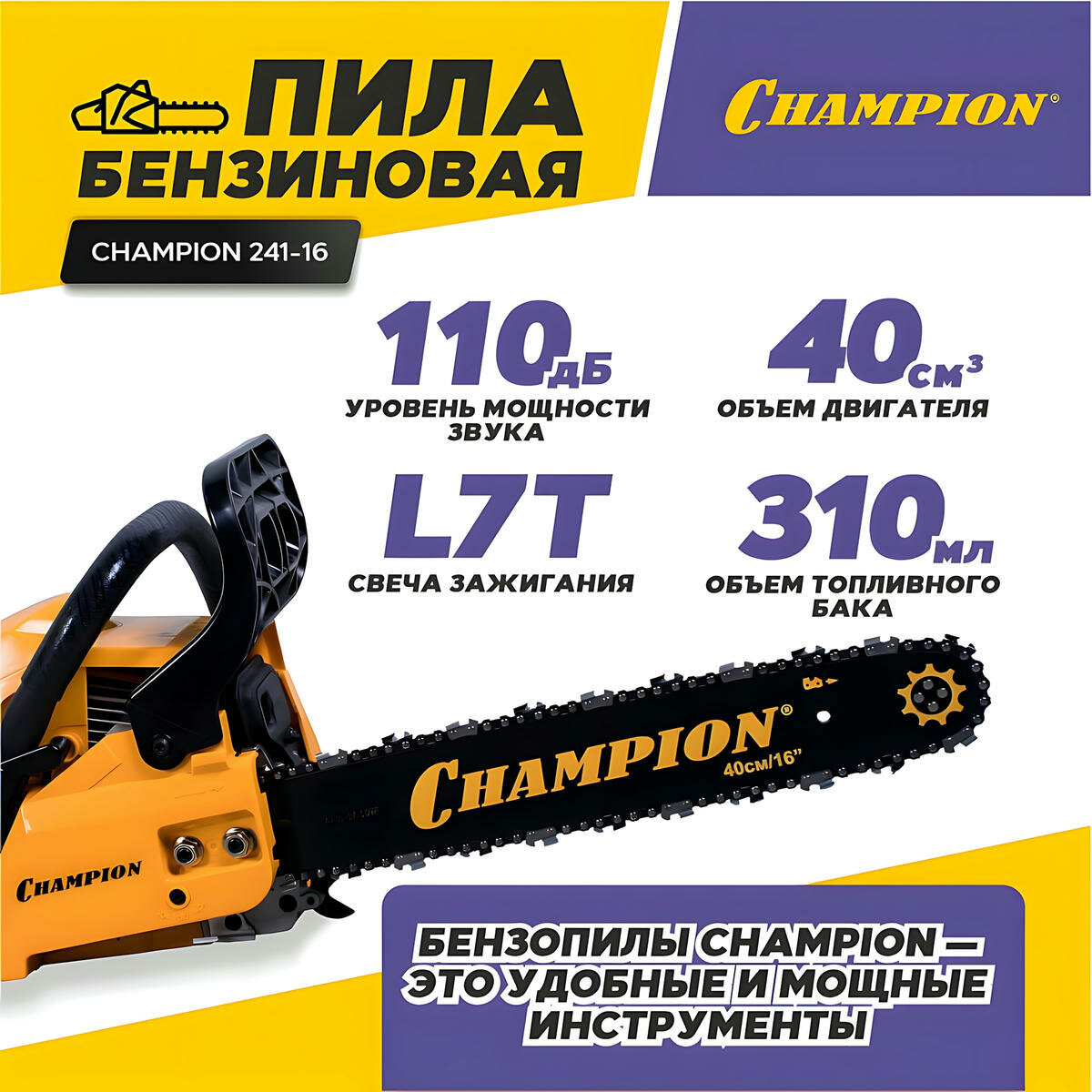 Купить Бензопила цепная бензиновая CHAMPION 241-16 с легким запуском / пила садовая для дров, для дачи (шина 16″, 40 см, 56 зв, мощность 1,8 кВт / 2,45 л. с.+ подарок (масло, свеча, цепь) с доставкой по всей России. Бензопила цепная бензиновая CHAMPION 241-16 с легким запуском / пила садовая для дров, для дачи (шина 16″, 40 см, 56 зв, мощность 1,8 кВт / 2,45 л. с.+ подарок (масло, свеча, цепь): сравнение цен, характеристики, фото, актуальное наличие и цены.