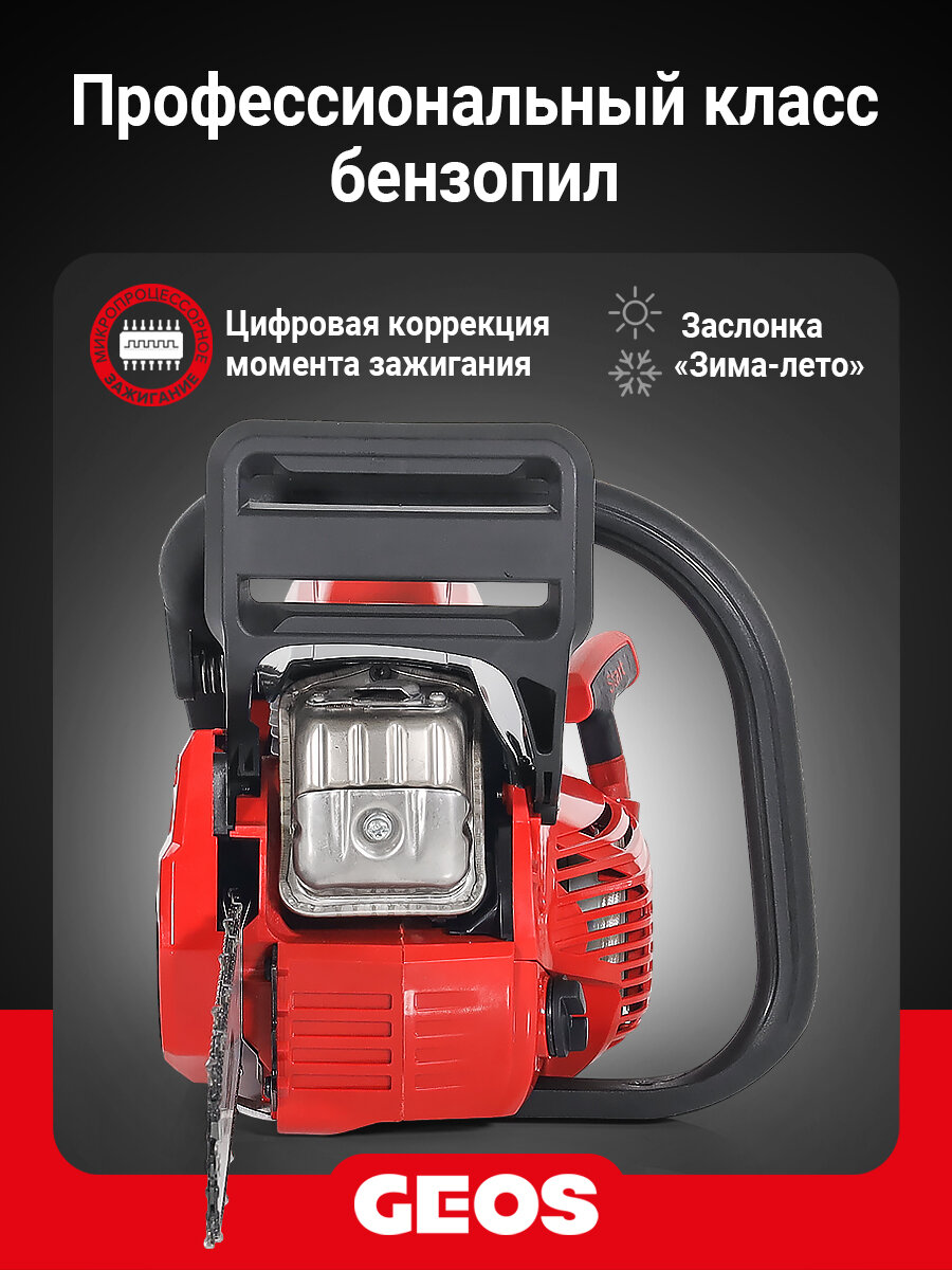Бензиновая цепная пила GEOS Max CSP137 способная выполнить все работы, связанные с валкой небольших деревьев, обрезки с них сучьев, а также по распилу поваленных деревьев на дрова.