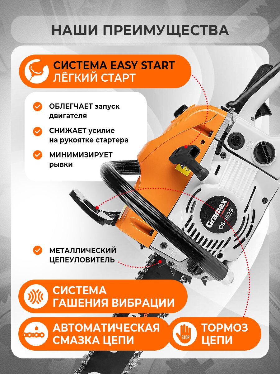 Бензопила цепная бензиновая GRAMEX GS-1629 (2,9л. с, шаг 0,325, шина 405мм): сравнение цен, характеристики, фото, актуальное наличие и цены.