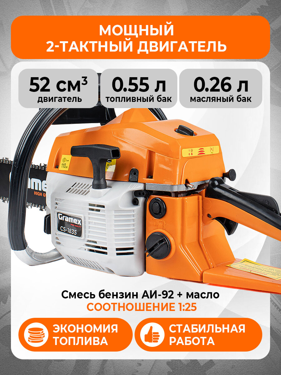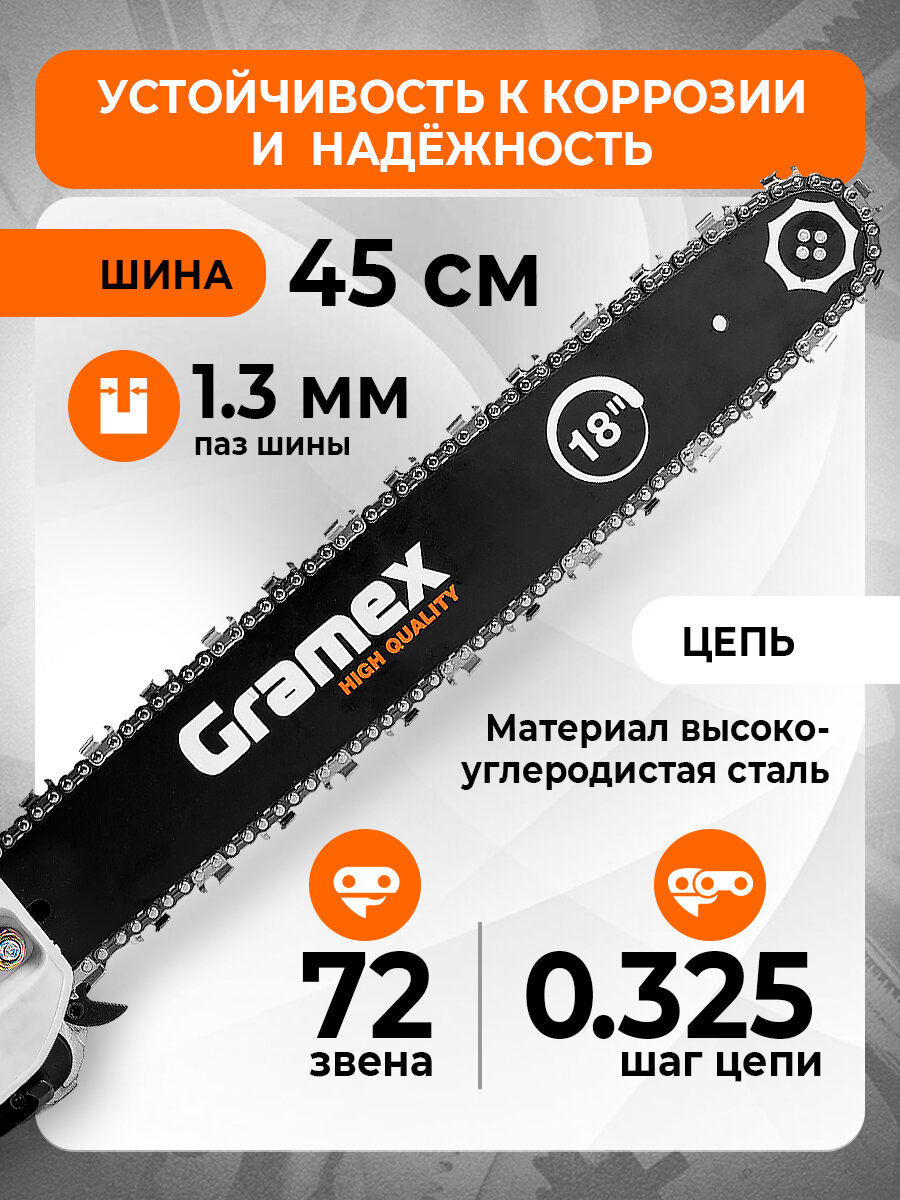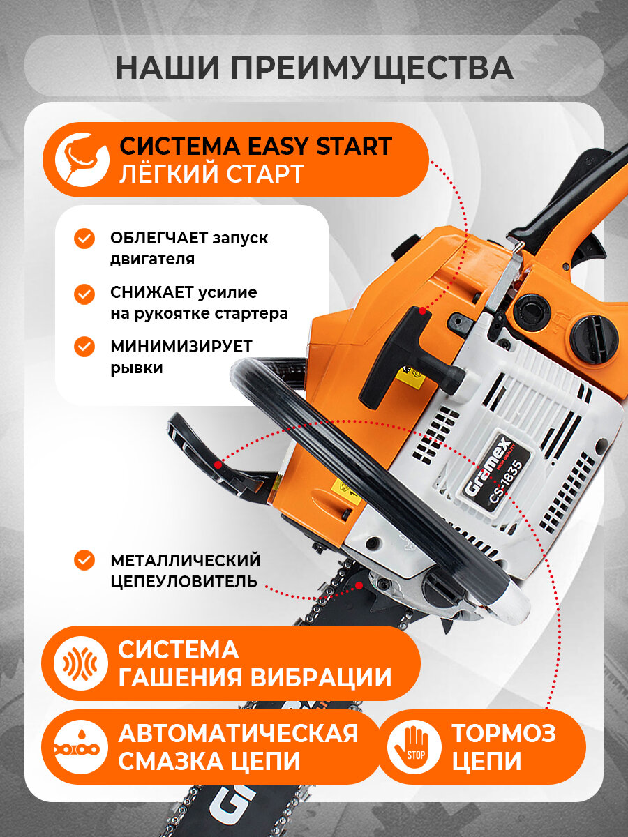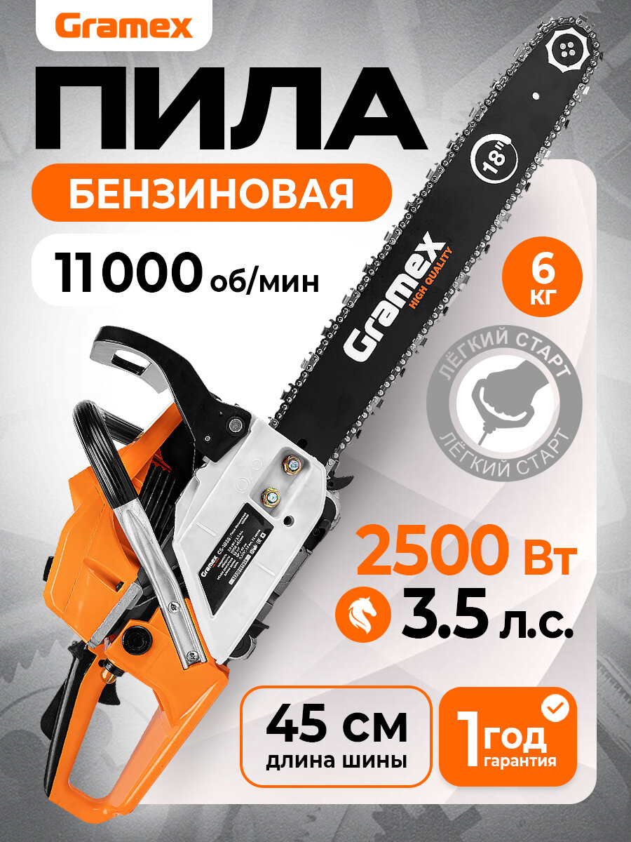 Бензопила цепная бензиновая GRAMEX GS-1835 (3,4л. с, шаг 0,325, шина 455мм): сравнение цен, характеристики, фото, актуальное наличие и цены.