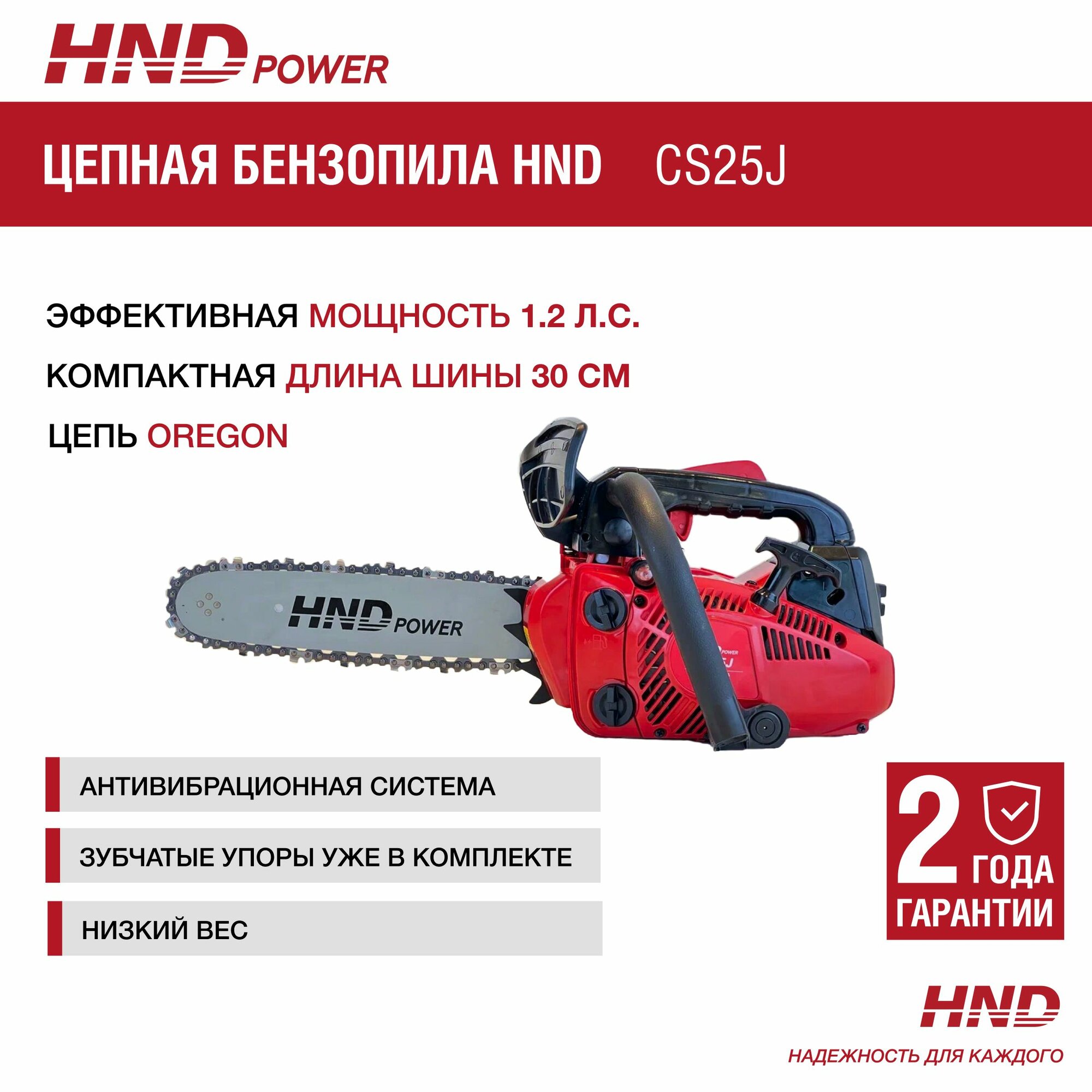 HND CS25J – маленькая и легкая бензопила с длиной шины 12 дюймов (30,5 см), несмотря на свои габариты, эффективно справится с решением поставленных задач, отлично подойдет для владельцев участков для пиления небольших деревьев, распила деревяных заготовок, ухода за садом или заготовки дров, а также при проведении небольших строительных работ. CS25J оснащается 2-тактным надежным двигателем IE34F рабочим объемом 25,4 см3 и мощностью 0,9 кВт.