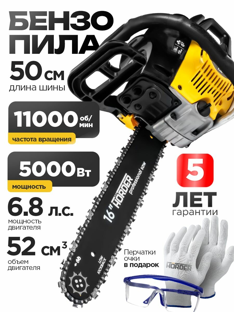 Бензопила цепная бензиновая HORDER (52 см3, 6,8 л. с, 5 кВт, 11000 об/мин): сравнение цен, характеристики, фото, актуальное наличие и цены.