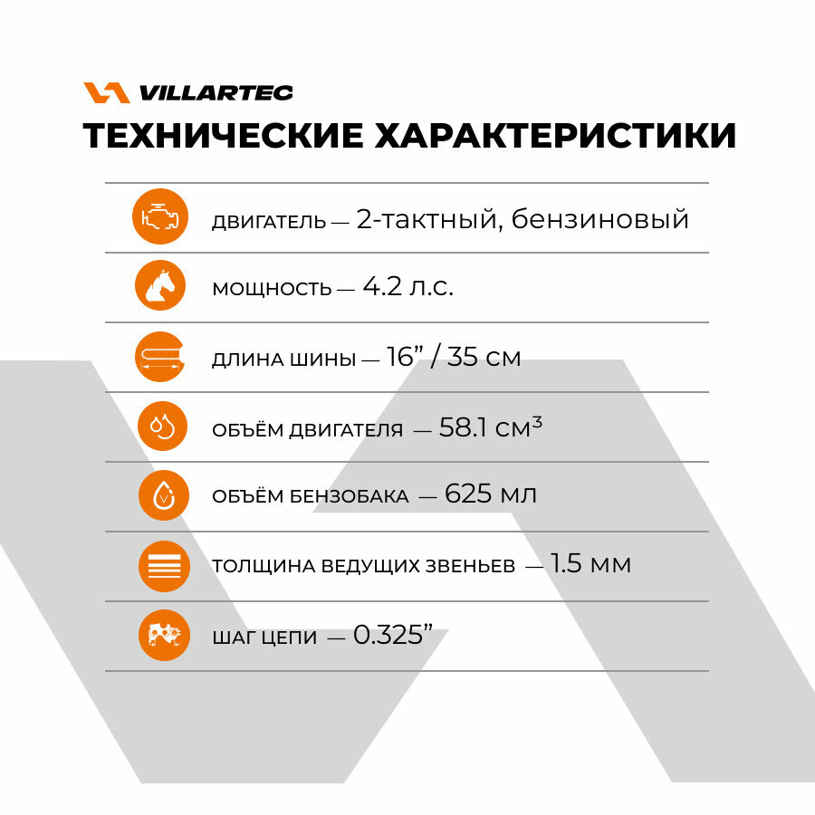 - Пильная гарнитура: 16-дюймовая (40 см) шина и цепь 1.5 мм 66 звеньев VILLARTEC