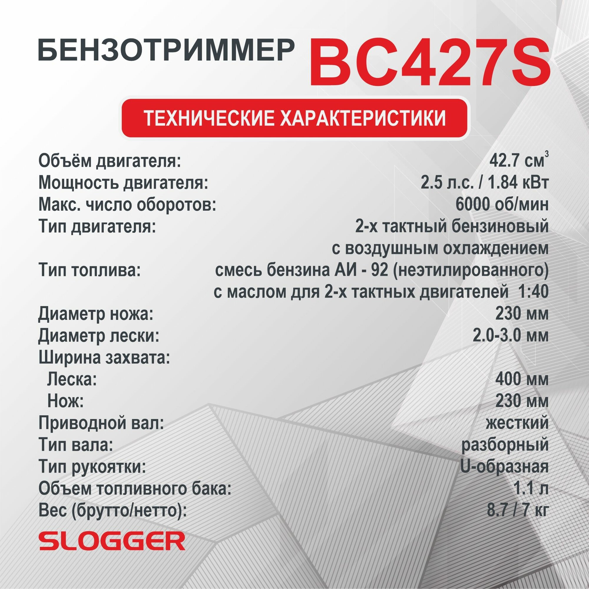 Триммер бензиновый Slogger BC427S, 2.5л. с
