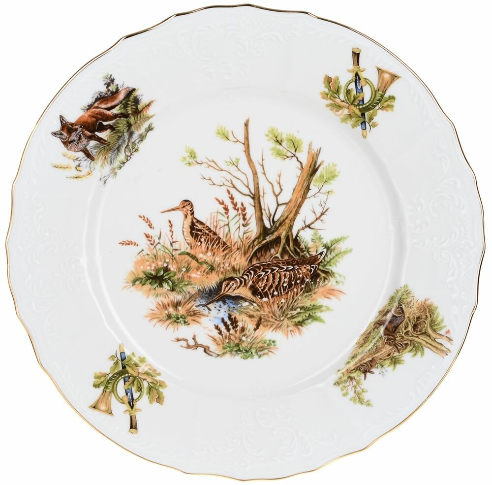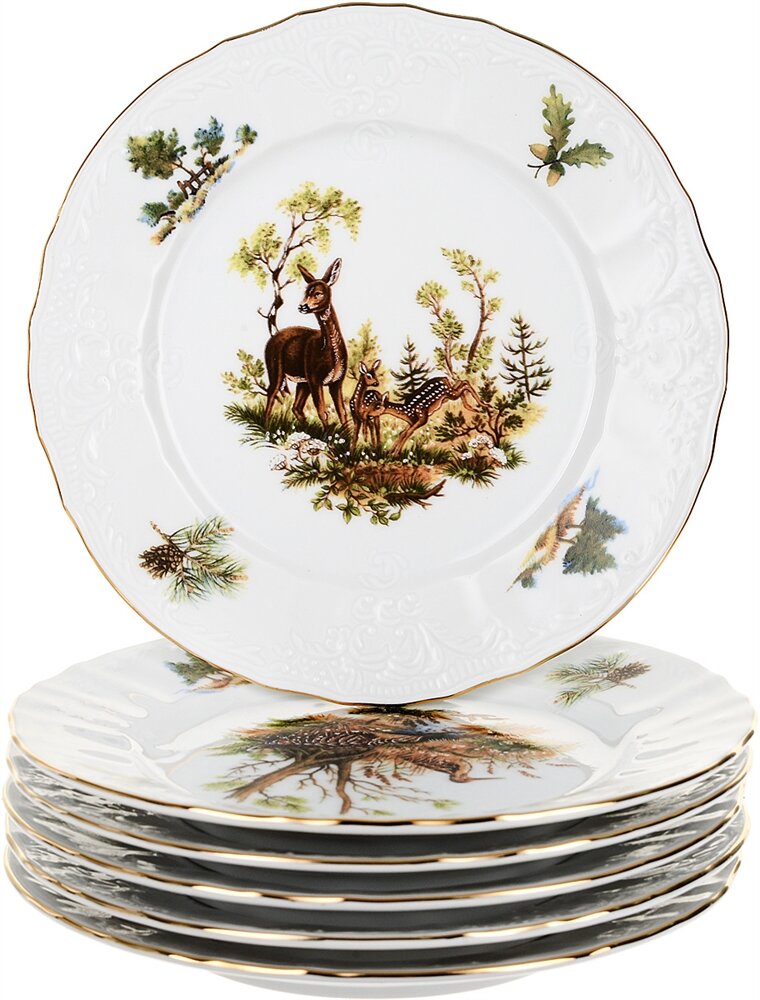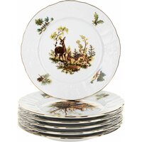 Bernadotte - утонченность и изящество чешского фарфора. Изысканный чешский фарфор легкий, но прочный, поэтому служит десятилетиями. А уникальный дизайн коллекционной посуды Бернадотт подчеркивает ее благородное происхождение. Бренд обладает собственным производством в самом сердце Карловых Вар – крупного месторождения глины. Выполненный в традиционном стиле барокко, фарфор Bernadotte производится как из белой глины, так и глины цвета слоновой кости. Именно благодаря высокопробному сырью фарфоровая посуда считается такой ценной. За сервизами очень легко ухаживать, ведь покрытие не теряет насыщенности при любых температурах. Коллекция предметов сервировки «Охотничьи сюжеты» - относится к классическим мужским сериям, но благодаря своему яркому орнаменту она придется по вкусу всей семье. Тарелки, блюда, салатники и другие предметы украшены выразительными рисунками диких животных – лисицей, зайцем, лосем, косулей и другими. Коллекция выполнена из белого фарфора. Роскошности ей добавляет золотая окантовка волнистых краев. Изящная тарелка красиво оформит праздничный стол и удивит вас лаконичным и стильным дизайном. Высокое качество и идеальное сочетание современных технологий с вековыми традициями создания посуды. Тарелка мелкая 21 см. Набор из 6шт.