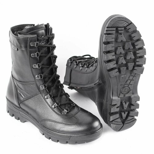 Верх: полуанилиновая кожа (1.3 – 1.5 мм) Подкладка: текстильный материал “RTEX” Подошва: полиуретан -5°.+40° Метод крепления: клеевой Стелька основная: «Salamander», супинатор, КПЖ Стелька вставная: «Ortholite» Подносок и задник: усиленный из термопластического материала Высота берца: 235 ±3 мм Фурнитура: петли (пр-во Италия), скоростная шнуровка. Глухой клапан предохраняет ногу от воздействия окружающей среды (пыль, грязь) Цвет: черный Вес: 1000 грамм (пара)