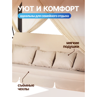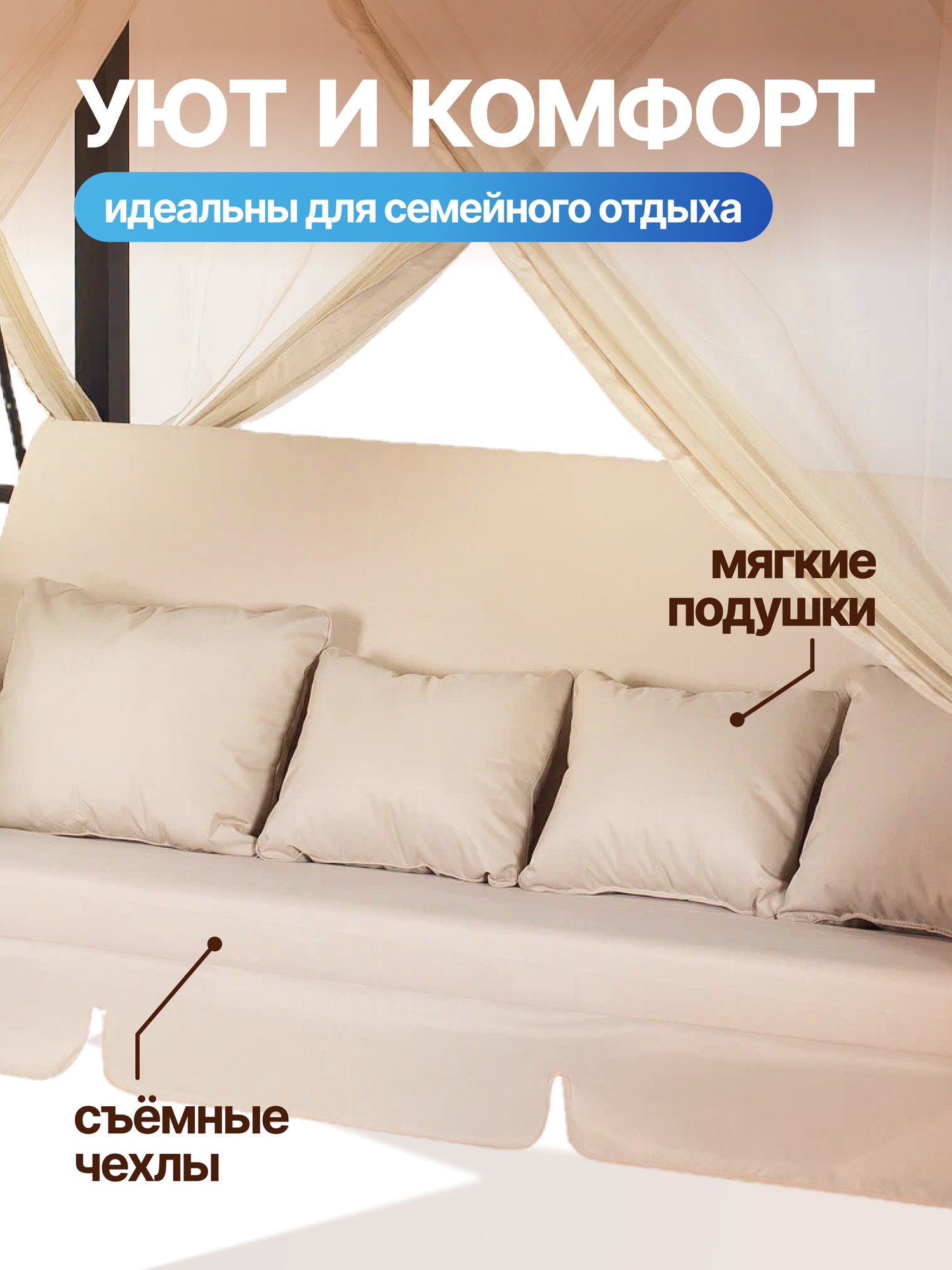 Уютное дизайнерское решение – 2 в 1: садовая беседка и полноценные 4-х местные качели с надежным механизмом фиксации спинки сидения и возможностью раскладывания качелей комфортную двуспальную кровать. Прекрасно дополнят интерьер любого загородного дома. Антимоскитная сетка на молниях. Наличие дополнительных аксессуаров в основном комплекте: 6 подушек , АМС, 4 подхвата Количество мест: 4-х местные Нагрузка, кг: 300 Размер сиденья (Д х Ш), мм: 1880 х 535 Каркас из квадратной трубы: 60 х 60 мм, диаметр трубы сиденья, мм: 25 Тип основания сиденья: Наварная решетка Материал мягких элементов: PE Outdoor 160 гр/м2 Материал набивки сидений: ППУ Материал и толщина наполнителя сиденья: Холкон 90 мм Тент со съемной антимоскитной сеткой Габариты качелей (Д х Ш х В), мм: 2540 х 1700 х 2450 Масса качелей, кг: 87,5 Механизм раскладывания: качели раскладываются пошагово за счет звеньев цепи Формат сидений: двублочный, сшитые между собой спинка с сиденьем