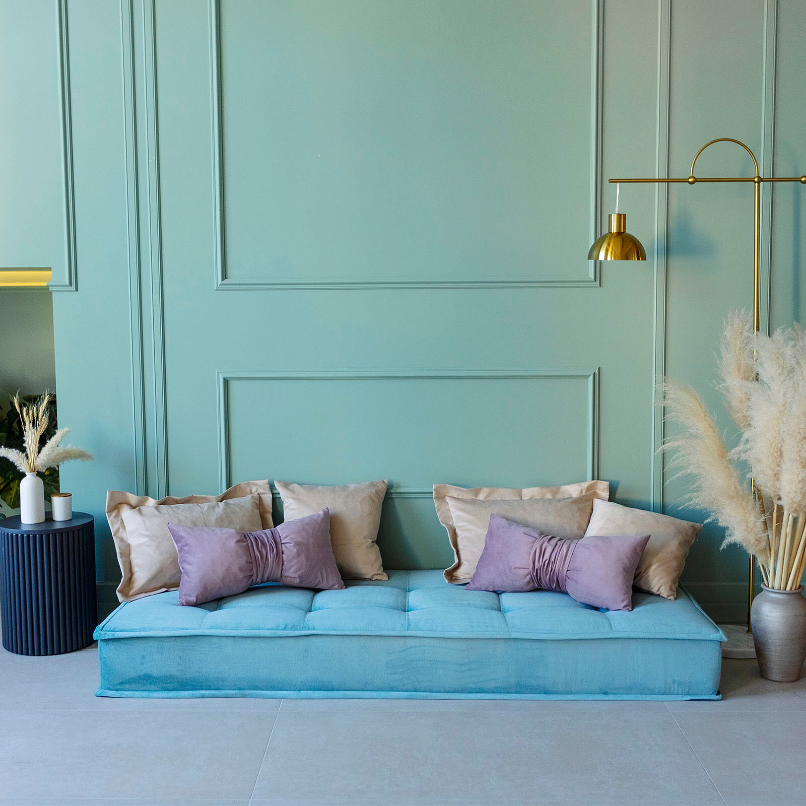 Купить Бескаркасный диван кровать для дома трансформер MIELLA Lora1Big, велюр светло-зеленый с бежевыми подушками с доставкой по всей России.