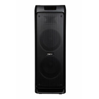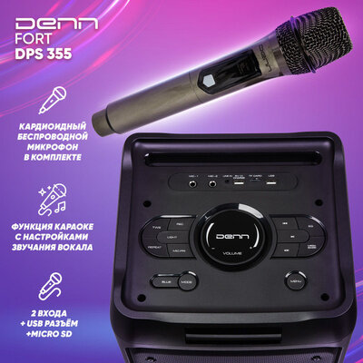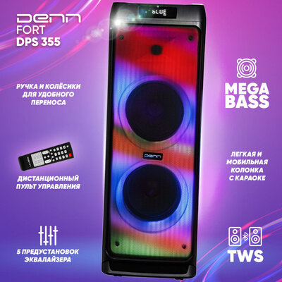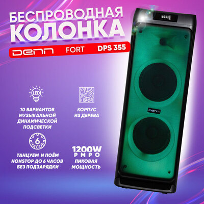 Музыкальная система Denn Partybooster Fort (DPS355) — колонка, выполненная в деревянном корпусе с динамической подсветкой лицевой панели. Модель оснащена двумя динамиками с фазоинвертором общей мощностью 120 Вт и сопротивлением 20 Ом, которые работают в стерео-режиме. Частотный диапазон — от 40 Гц до 20 кГц. Система поддерживает подключение микрофона для караоке с возможностью записи. На корпусе установлены разъемы 3,5 мм, 6,3 мм, слот для карты microSD, линейный вход и порт USB для подключения флеш-карт. Беспроводной интерфейс подключения представлен модулем Bluetooth версии 5.0. Все разъемы расположены на верхней части вместе с панелью управления, которая позволяет менять громкость (поворотный контроллер), включать режим TWS для сопряжения двух колонок, переключать композиции и изменять цвет подсветки. Вся информация отображается на встроенном цифровом дисплее. Поддерживается управление с комплектного пульта ДУ.
