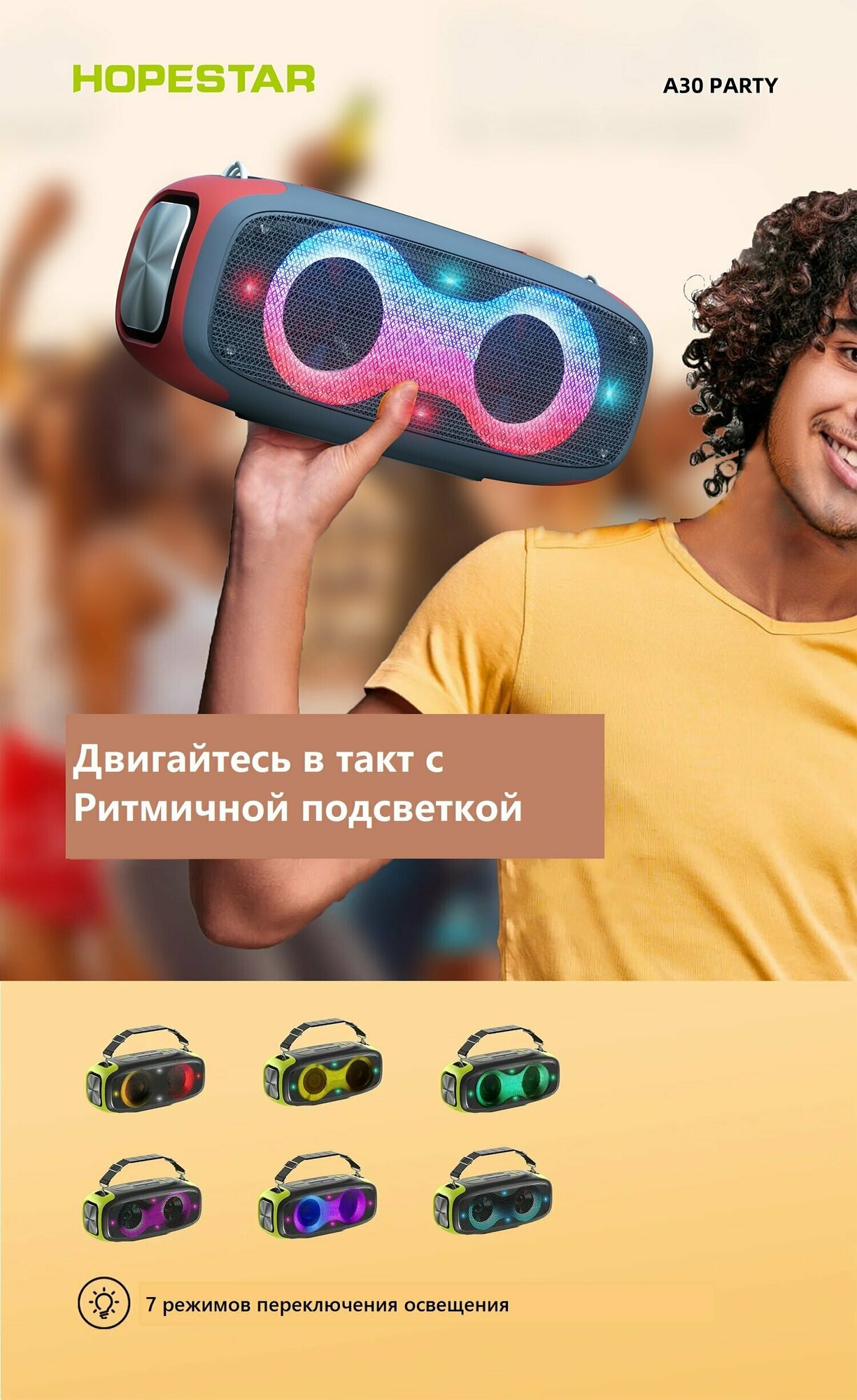 | Особенности | FM-радио, влагозащищенный корпус, встроенный микрофон (функция HandsFree), караоке, поддержка microSD, режим Power Bank, ремешок, ручка, световые эффекты |