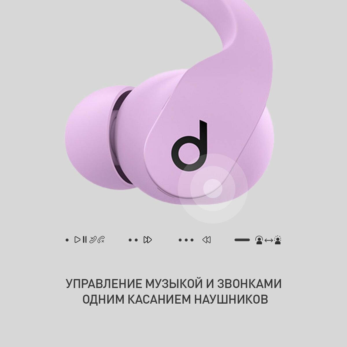 Удобный дизайн Beats Fit Pro оснащены удобными гибкими заушными креплениями. Эффективность универсального дизайна этих креплений тестировали спортсмены, занимающиеся разными видами спорта. Можете не сомневаться: наушники останутся на месте как во время работы, так и тренировок. А благодаря специальным отверстиям, которые выравнивают давление, эти наушники можно без дискомфорта носить весь день, не снимая. В комплект входят мягкие силиконовые вкладыши трёх размеров, среди которых можно выбрать оптимальный. Специальный тест Fit Test, доступный как для устройств Apple, так и Android, поможет выбрать правильный размер для максимально плотной посадки и наилучшего звучания наушников. В окружении звука Beats Fit Pro обеспечивают мощное сбалансированное звучание за счёт использования специальной акустической системы и способны работать в течение всего дня. Уникальный драйвер с двухэлементной диафрагмой размещается внутри двухкамерного корпуса, что помогает добиться невероятной чистоты стереозвука с превосходным разделением по каналам. А передовой цифровой процессор оптимизирует громкость и чёткость звучания, одновременно обеспечивая шумоподавление без искажений. Наушники Beats Fit Pro поддерживают технологию пространственного аудио с функцией динамического отслеживания движений головы, позволяя вам полностью погрузиться в музыку, фильм или игру. Для динамического отслеживания движений головы используются гироскопы и акселерометры: когда вы поворачиваете голову, они помогают адаптировать звук таким образом, как будто вы находится в самом центре многомерного звучания. Управляйте тем, что вы слышите Два различных режима прослушивания дают вам полный контроль над звуком. Адаптивная система активного шумоподавления (ANC) выполняет калибровку звука в реальном времени, выявляя нежелательные внешние шумы и оптимизируя мощность звука. А когда вам нужно быть в курсе того, что происходит вокруг, можно легко переключиться в Прозрачный режим. Наружные микрофоны улавливают окружающие звуки и объединяют их с музыкой. Вы можете в любой момент изменить режим прослушивания и выбрать тот, который вам больше подходит. Чип Apple H1 Благодаря чипу Apple H1 наушники Beats Fit Pro готовы помогать вам в любых ситуациях. Они мгновенно образуют пару со всеми вашими устройствам Apple — достаточно одного касания. Если вы отложите iPhone и решите продолжить работу на Mac или iPad, функция автоматического переключения мгновенно перенаправит звук. А благодаря функции «Совместный доступ к аудио» одновременно можно использовать ещё одну пару наушников Beats (или Apple AirPods), чтобы слушать любимую музыку вместе с другом. Музыка весь день Полностью заряженные наушники обеспечивают до 6 часов прослушивания6, а зарядный футляр карманного размера позволяет увеличить это время ещё на 18 часов.7 Это означает, что в общей сложности Beats Fit Pro дают возможность слушать музыку до 24 часов без стационарной подзарядки. Без использования активного шумоподавления и Прозрачного режима наушники обеспечивают до 7 часов воспроизведения. А если они разрядились, достаточно поместить их в зарядный футляр всего на 5 минут, и благодаря технологии зарядки Fast Fuel после этого они смогут работать ещё до 1 часа. Долго работающий аккумулятор? Это мощный ход. Громкое и чёткое звучание Благодаря встроенному акселерометру и тех