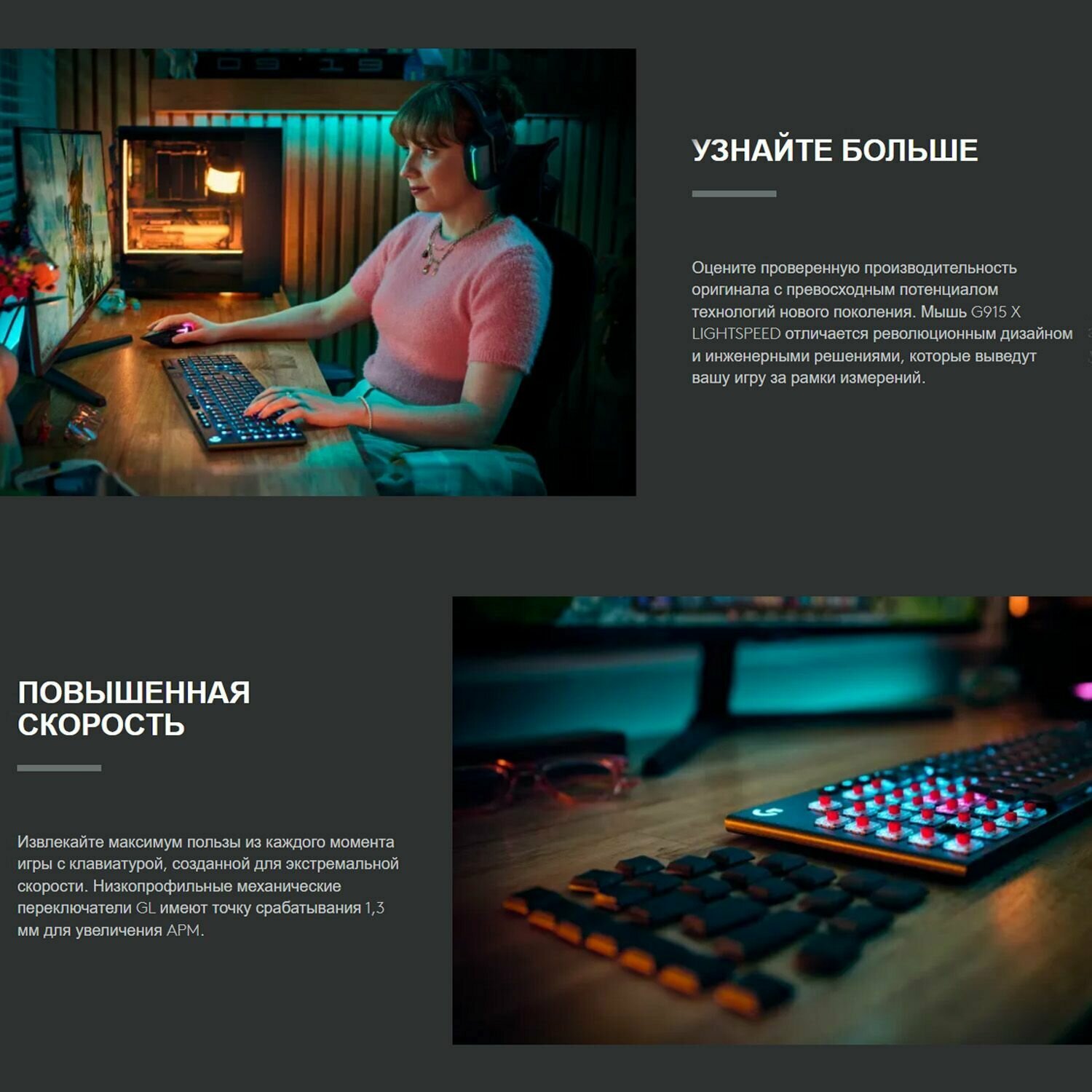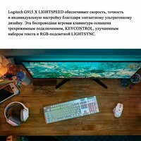 | Дополнительная информация | сила нажатия 50 г, расстояние до точки срабатывания 1,5 мм, 2 профиля подсветки, 3 профиля макросов, lightspeed bluetooth, RGB-подсветка по технологии lightsync с возможностью настройки для каждой клавиши, медиа блок |