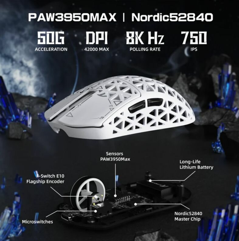 частота опроса 8000 ГЦ Максимальная частота опроса в беспроводном режиме обеспечивает: Отклик 0.125 мс против стандартных 1 мс у конкурентов Плавное отслеживание резких движений в шутерах и MOBA Режимы 1000/2000/4000/8000 Гц с переключением через драйвер датчик PAW3950 Флагманский сенсор с характеристиками: Максимальное разрешение: 42 000 DPI Ускорение: 50G Точность: ±1% Калибровка по 15 типам поверхностей Поддерживает мгновенное переключение DPI.
