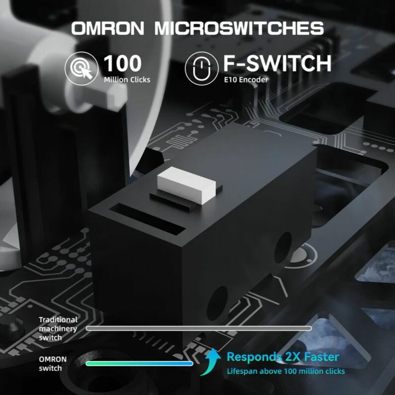 переключатели OMRON Оптические микропереключатели Omron гарантируют: Ресурс 100 млн нажатий Ход кнопки: 0.2 мм (быстрый отклик) Тактильный отклик как у механической клавиатуры энкодер F-SWITCH E10 Премиальный энкодер с магнитным позиционированием: 24 шага за полный оборот Ресурс: 5 млн циклов веб-драйвер SHARKSUITE Облачное ПО для тонкой настройки: Создание макросов с задержкой до 1 мс Синхронизация RGB-подсветки с играми через SharkSync 5 профилей настроек с возможностью экспорта Статистика использования (нажатия, пройденная дистанция)