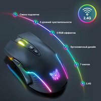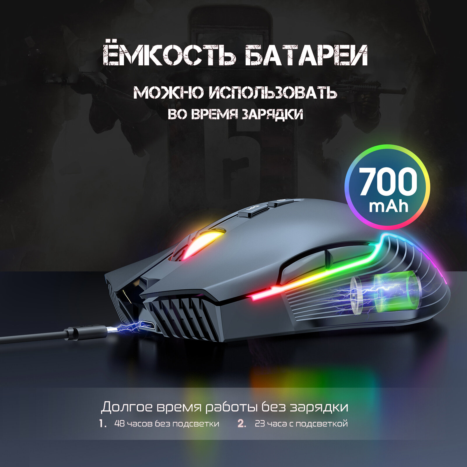 Мышь оснащена 2.4 ГГц беспроводным подключением, что обеспечивает свободу движений и отсутствие проводов. После подключения USB-приемника к компьютеру или ноутбуку, мышь сразу готова к использованию. Встроенная батарея мощностью 700 мАч обеспечивает до 23 часов работы (RGB) / 48 часов (выключения).