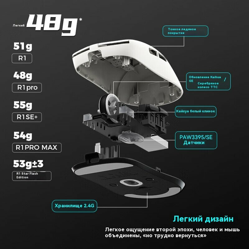 | Комплектация | Товарная накладная: Беспроводной приемник, шнур для зарядки/передачи данных, удлинитель приемника, небольшая наклейка на ножку из ПТФЭ, руководство пользователя, нескользящая наклейка (черная с черным, белая с белым). |