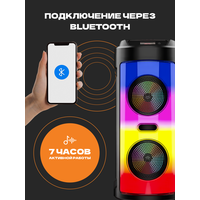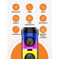 FM-радио, влагозащищенный корпус, караоке, поддержка microSD, ремешок, световые эффекты
