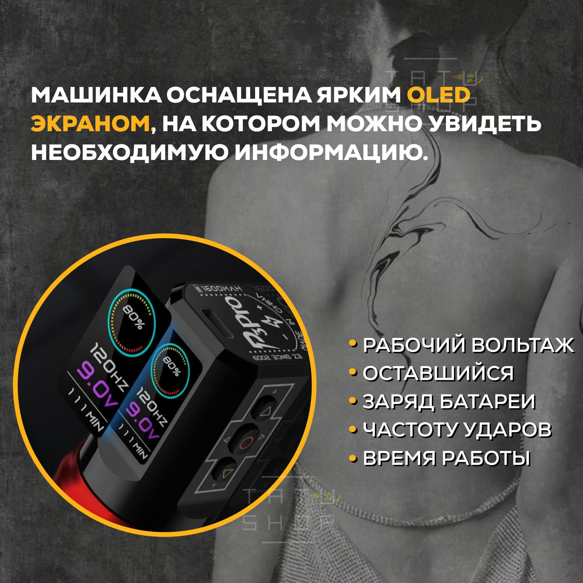 Машинка оснащена ярким OLED экраном, на котором можно увидеть необходимую информацию. Она отображает рабочий вольтаж, оставшийся заряд батареи, частоту ударов и время работы. Благодаря этим сведениям, мастер сможет понимать, как распределять нагрузку во время сеанса.