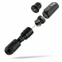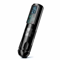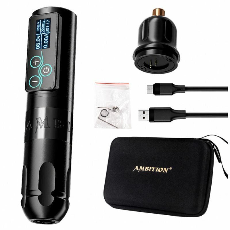 Ambition Vibe имеет тот же размер, что и Soldier: 145 мм в длину и 32 мм в диаметре. Мы усовершенствовали материал изготовления и сделали его из высокопрочного алюминия, что позволило уменьшить вес машинки до 185г. Вместе с этим мы улучшили балансировку, что позволяет сделать процесс нанесения татуировки во время длительных сеансов более комфортным. Батарея Ambition Vibe оснащена высокочувствительными сенсорными кнопками, что в корне меняет представление о работе с привычными беспроводными тату машинками. Переключать вольтаж можно даже тогда, когда вы уже в перчатках, а машинка обернута барьерной защитой. Машинка Ambition Vibe оснащена светодиодным экраном, на котором можно увидеть необходимую информацию. Она отображает рабочий вольтаж, оставшийся заряд батареи, частоту ударов и таймер. Благодаря этим сведениям, мастер сможет понимать, как распределять нагрузку во время сеанса. Емкость аккумулятора составляет 2400 мАч. После проведения многочисленных тестов было выявлено, что полностью заряженный аккумулятор выдерживает более 7 часов работы на вольтаже 8. Аккумулятор полностью заряжается за 3 часа с помощью кабеля Type-C. Машинка оснащена функцией jump-start, которая подает 10В на двигатель в момент старта аппарата, позволяя с легкостью использовать даже такие крупные пайки, как 29MG. На дисплее Ambition Vibe отражается текущий вольтаж и частота ударов в минуту, так что при изменении первого, показатели второго также будут меняться. Благодаря информации о количестве ударов в минуту, можно получить больше информации о работе машинки. 4.5V-12V - рабочий вольтаж, что соответствует ~72Гц - ~196 (уд/мин). Изменение вольтажа происходит с шагом 0.1V. Ambition Vibe оснащена бесколлекторным мотором Ambition Custom Motors и эксцентриком 4.0, что обеспечивает дополнительную мощность и более продолжительный срок службы машинки. Эксцентрик изготовлен из нержавеющей стали, которая является долговечным материалом. Это обеспечивает машинке сохранять баланс при работе как с контуром и плотным закрасом, так и тенями, а также цветными работами.