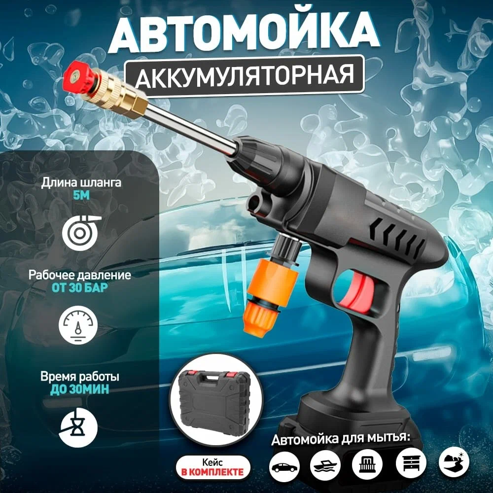 Беспроводная мойка на аккумуляторе Позволит помыть автомобиль и другую технику имея только ёмкость с водой Мощная струя бьёт до 6-8 метров Высокое давление 30 бар В наборе есть: Мойка, 2 насадки разного потока, емкость для создания пены, сменный фильтр, 2 аккумулятора на 48V. 2 Аккумулятора по 48V Кейс для хранения и переноски.