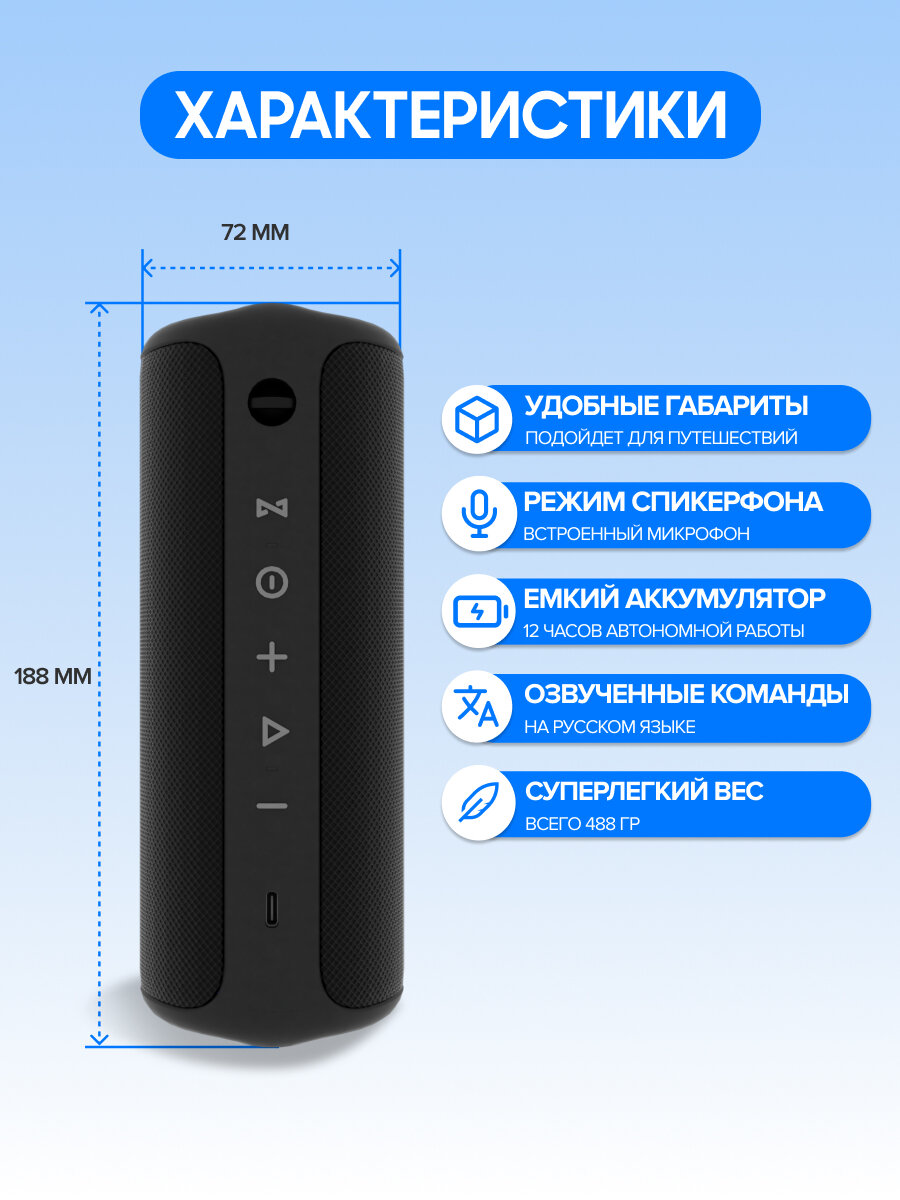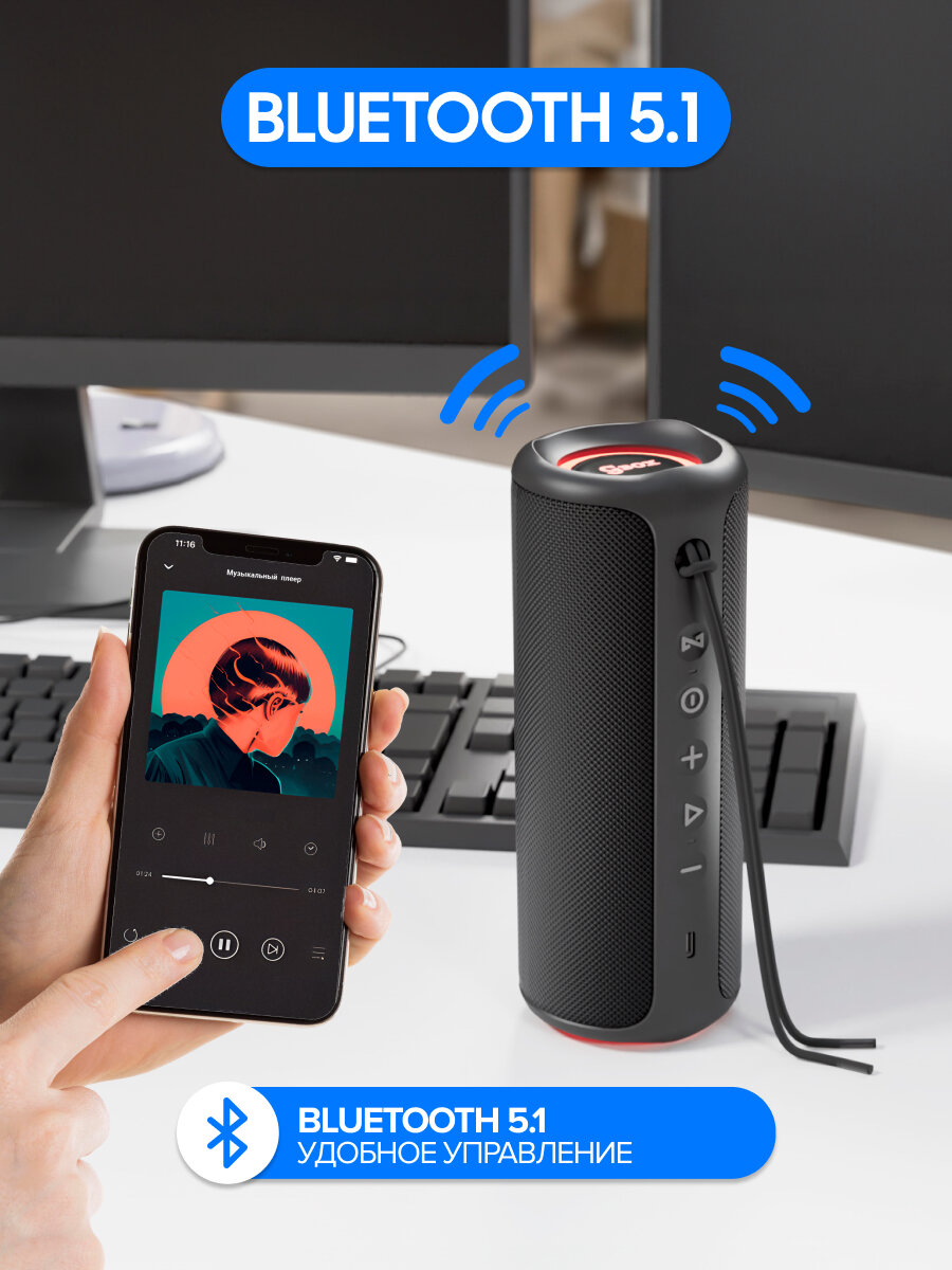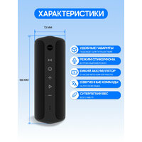 Эта водонепроницаемая маленькая колонка представляет собой акустическую систему, через которую можно подключаться к различным гаджетам с версией Bluetooth 5.1, в том числе к смартфонам и планшетам с операционной системой iOS и Android, к компьютеру ПК или ноутбуку на системе Windows, а также к телевизору. С помощью кнопок на корпусе можно легко управлять аудиосистемой – включать или выключать устройство, сопрягаться по блютуз, регулировать громкость, что позволяет настроить звук по своему вкусу, и моментально переключать треки. А ещё в режиме «Громкая связь» можно отвечать или отклонять вызовы, которые поступают на смартфон!