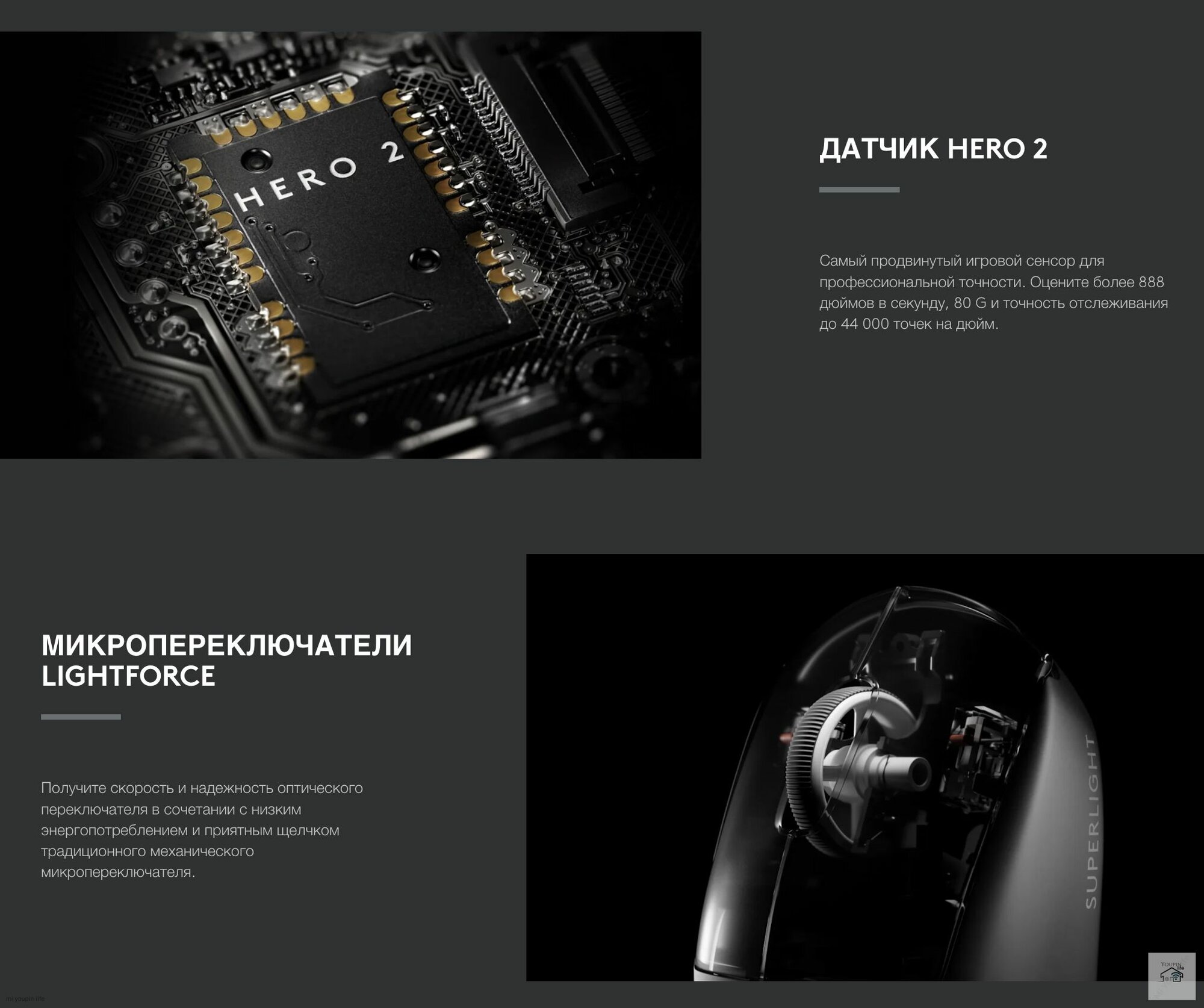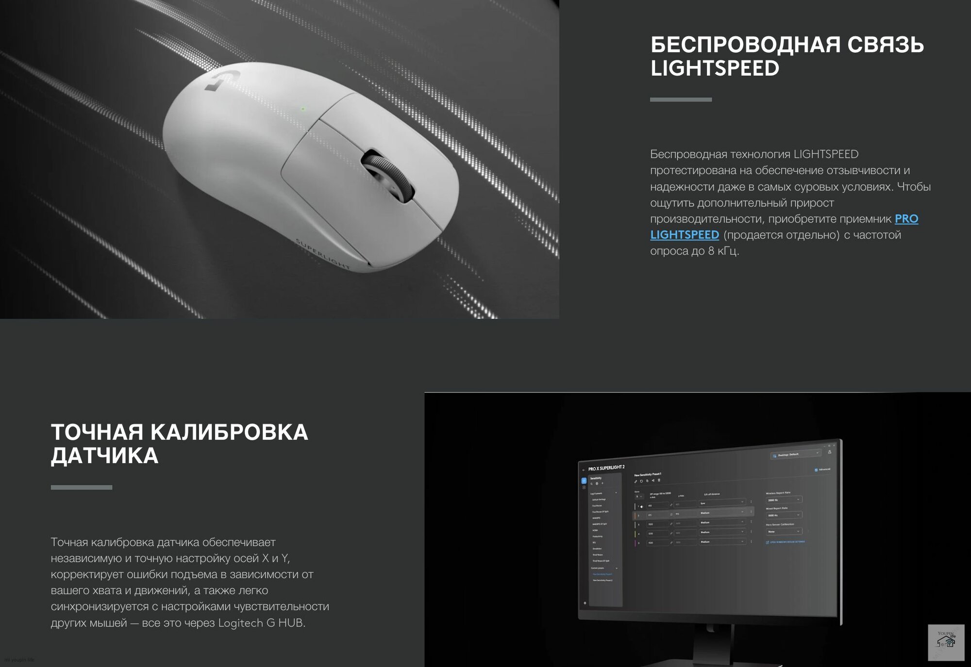 | Дополнительная информация | Нижняя поверхность с тефлоновым покрытием без добавок, пружинный механизм работы кнопок, 32-разрядный микропроцессор ARM, поддержка технологии беспроводной зарядки PowerPlay (система беспроводной зарядки Logitech G Powerplay приобретается отдельно) |