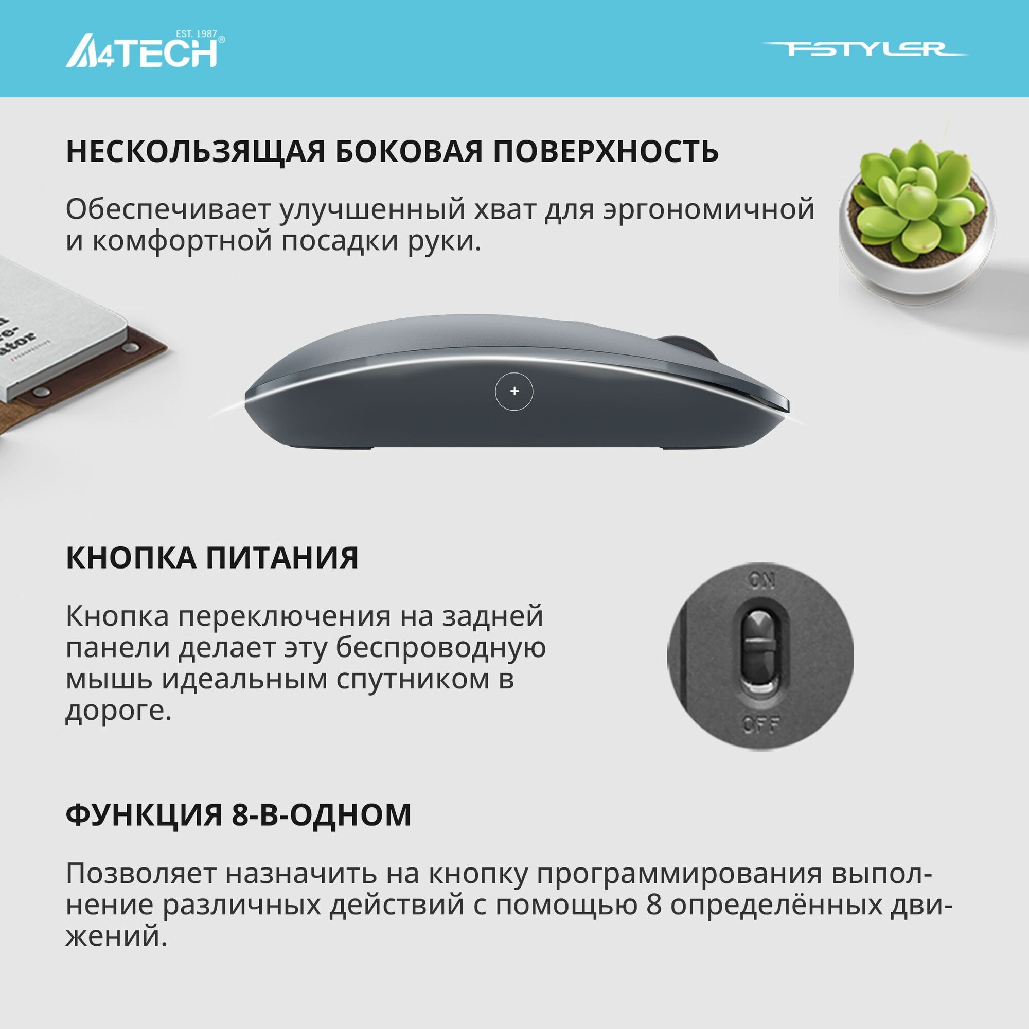 Мышь A4TECH Fstyler FG20, оптическая, беспроводная, USB, серый [fg20 grey]