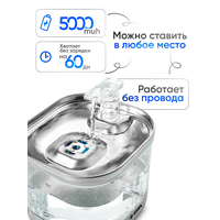 Умный фонтанчик работает на аккумуляторе 5000 mHa, что делает его портативным и удобным в использовании. Не нужно искать розетку, так как батарейки хватает до 2-х месяцев. Он оборудован многоступенчатой системой фильтрации для очистки жидкости, что обеспечивает здоровые почки вашего любимца. Бесшумная работа прибора не испугает вашего любимца.