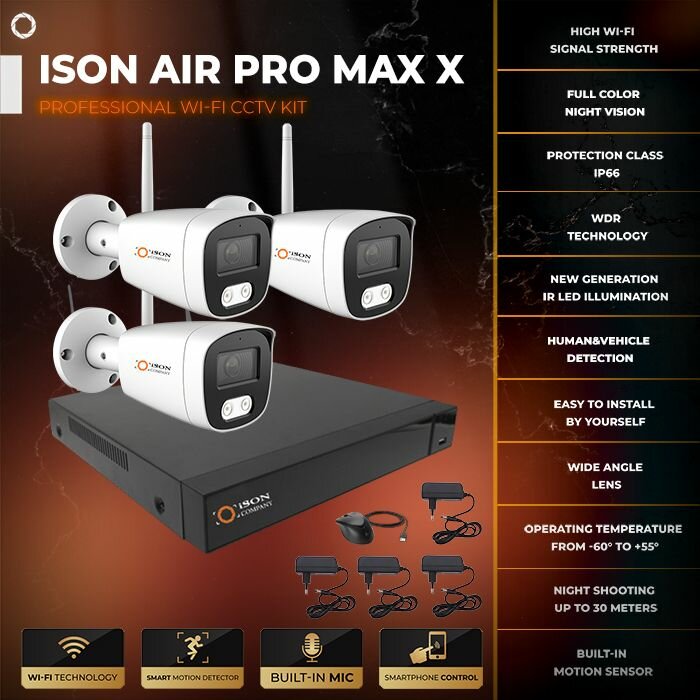 Беспроводная система видеонаблюдения на 8 мегапикселей ISON AIR-PRO-MAX-X-3 на 3 камеры