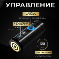 Вольтаж регулируется от 5 до 12 вольт. Время зарядки аккумулятора составляет всего 1,5 часа. На корпусе расположен дисплей, он показывает рабочий вольтаж и процент заряда аккумулятора. Также на нем расположены три кнопки, кнопка включения и отключения питания и две кнопки регулировки напряжения.