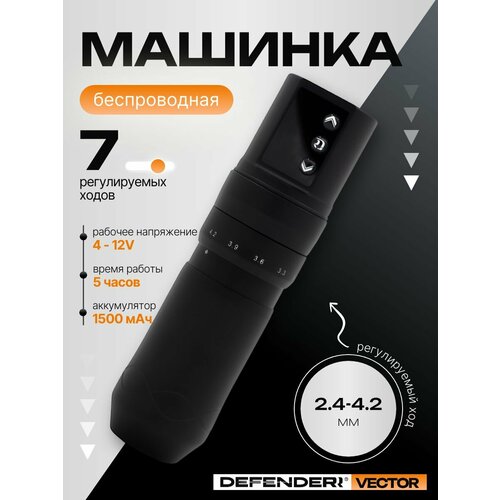 Беспроводной аппарат DEFENDERR VECTOR. Универсальная и манёвренная машинка, которую можно полностью настроить под любую технику в несколько касаний. В основе аппарата — инновационный двигатель нового поколения, разработанный специально для компании Defenderr. Именно он обеспечивает плавную, точную и бесшумную работу аппарата. Мотор надежно защищен от перегрузки, короткого замыкания и перегрева при длительной работе. Аппарат может работать не только от аккумулятора, но и от стандартного блока через дополнительный адаптер с разъемом RCA. Выбирая беспроводной аппарат, вы расширяете свои возможности, освобождая себя от проводов и связанных с ними ограничений. При этом аппарат может работать не только от аккумулятора, но и от стандартного блока через дополнительный адаптер с разъемом RCA. Беспрерывная работа от аккумулятора ≈ 5 часов, в зависимости от выбранного вольтажа и хода иглы. Дополнительный аккумулятор, который идет в комплекте, позволяет моментально переключаться, увеличивая время работы без подзарядки вдвое. Аккумулятор заряжается за 2 часа через стандартный универсальный клипкорд USB Type-C. Аппарат VECTOR совмещает три аппарата в одном, ведь он оснащен 7 сменяющими эксцентриками, которые удобно переключаются на манипуле. Короткий ход иглы отлично справится плотным прокрасом и линейной техникой; средний подойдет для пудрового и воздушного напыления, а длинный ход позволит работать на более глубоких слоях, чтобы делать татуировки или работать с плотной кожей. Аппарат сконструирован с учетом требований ведущих мастеров. Девайс практически лишен вибрации, комфортно сидит в руке и имеет противоскользящее покрытие. Съемный аккумулятор плотно и надежно примыкает к манипуле для стабильного контакта. Несмотря на то, что аппарат прибавляет в весе за счет мощного наполнения, держать его достаточно удобно: центр тяжести идеально сбалансирован таким образом, чтобы мастер не чувствовал напряжения во время работы. VECTOR оснащен процессором нового поколения, который обеспечивает безупречное управление. Светодиодный дисплей мгновенно реагирует на каждое ваше касание, позволяя удобно регулировать мощность аппарата. Таймер для подсчета рабочего време- ни, который можно поставить на паузу. Функция Jump-start (для работы с жёсткими тату картриджами). Удержание кнопки питания — включение и выключение аппарата. Быстрое двойное нажатие на кнопку питания — включение и выключение функции Jump-start.