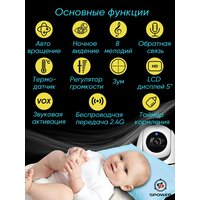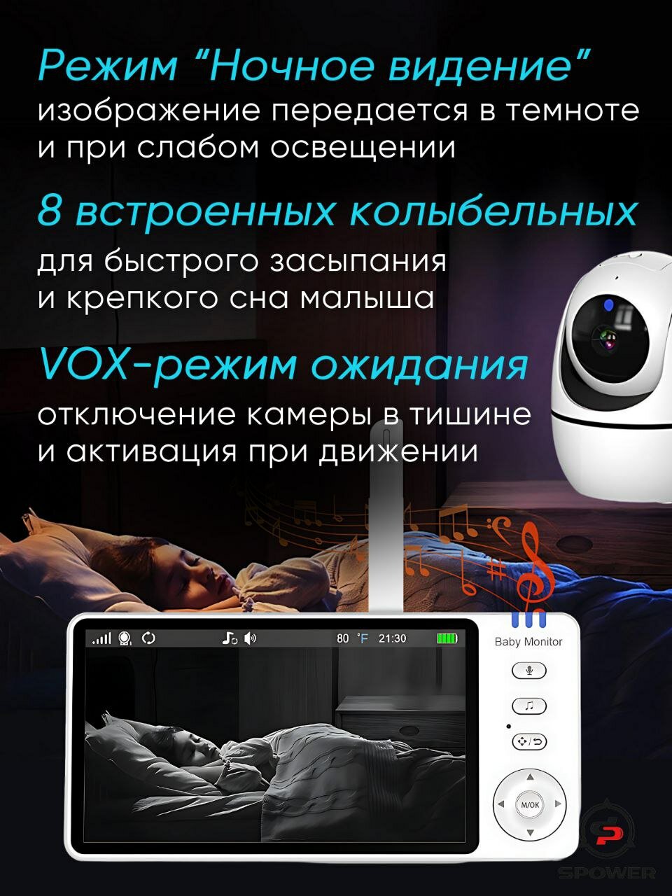 Портативная беспроводная видеоняня предназначена для помощи мамам новорожденных младенцев и маленьких малышей, которые научились ползать, но еще не очень хорошо передвигаются на ногах. Умная няня состоит из двух частей: камера, для наблюдения за ребенком, вращающаяся на 360 градусов без образования слепых зон, и монитор, через который мама наблюдает за безопасностью чада. Радиус действия составляет до 300 метров на открытом воздуха и до 40 метров в жилом помещении. Кроме того в комплект входят два блока питания и два зарядных кабеля, для обеспечения бесперебойной работы устройств. Помимо отличного видеообзора супер няня обладает свойством обратной связи, что позволяет маме, одновременно делать свои домашние дела, находясь в другой комнате и одновременно всегда находиться рядом с младенцем, успокаивая его своим голосом и ласковыми речами или включить колыбельную песенку и помочь младенцу заснуть. Няня помнит 8 самых распространенных мелодий, так что можно подобрать либо, любимую, либо радовать разнообразием подготовку ко сну. Кроме того искусственный интеллект в виде привлекательного робота содержит в себе датчики комфортной температуры, шума, и обязательно сообщат маме о необходимости укрыть ребенка или наоборот открыть форточку, о появлении шума и, даже не даст потеряться во времени и напомнит сменить подгузник и покормить кроху для поддержания его комфорта и здорового роста. Камера работает так же в режиме ночного видения и записывает сон малыша, так же автоматически отключается при спокойной обстановке и мгновенно включается при появлении малейшего шума. С помощью этого устройство, вы будете в любом месте смотреть за малышом. Можно одновременно заниматься приготовлением еды, уборкой, пойти в душ, поговорить с близким или посмотреть сериал и при этом всегда видеть ребенка и быть рядом с ним. Видео няня присмотрит за всем и даст звуковое и световое оповещение при возникновении громкого звука или необходимости покормить.