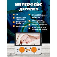голосовая активация (VOX), датчик влажности, датчик движения, датчик температуры, двусторонняя голосовая связь, колыбельные мелодии, ночник, подвижная камера, работа от сети 220 В, термометр, функция ночного видения