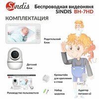 Видеоняня Sindis BH-7HD имеет белый цвет и поставляется в комплекте с родительским и детским блоками, адаптером, набором шурупов и инструкцией по эксплуатации.
