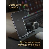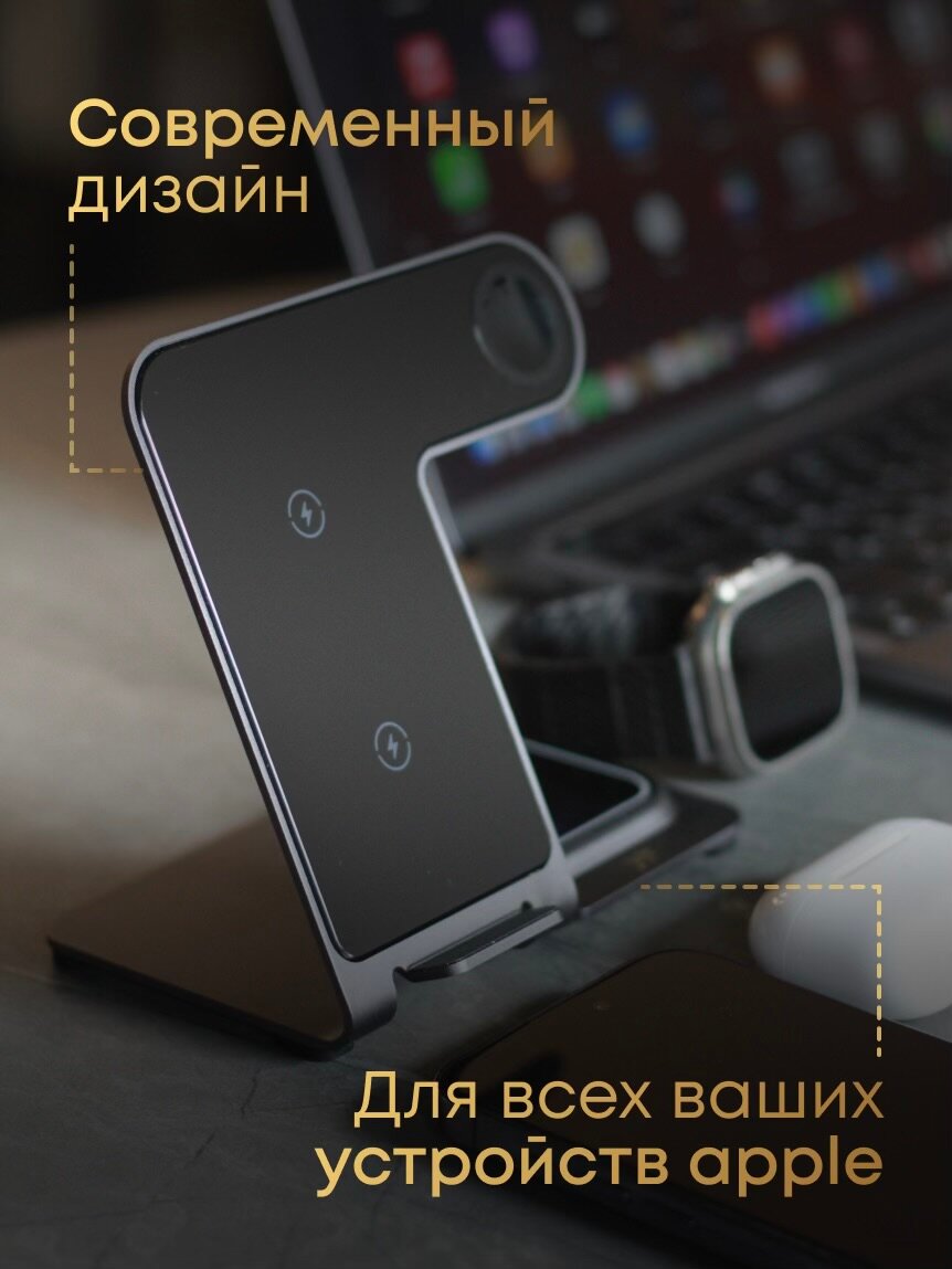 Беспроводная зарядная станция обладает стильным, современным дизайном и отличается максимальной функциональностью. Зарядная станция одновременно заряжает три apple устройства и обеспечивает полный комфорт в ходе повседневной эксплуатации.